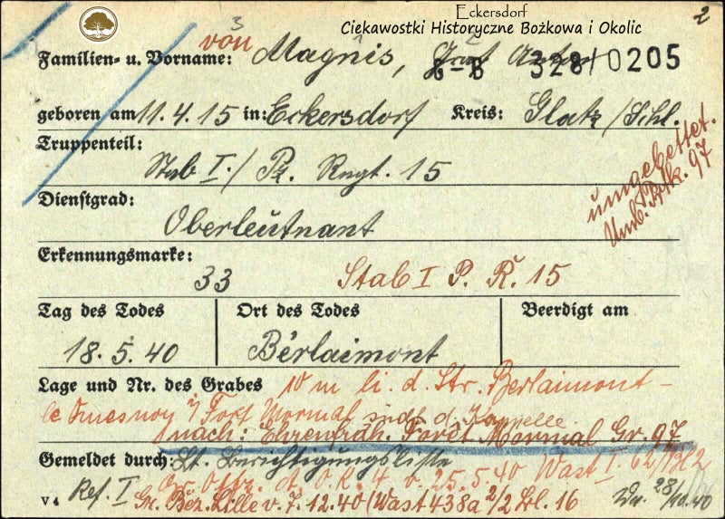 Pogarszająca się sytuacja i nastroje społeczne spotęgowały informację o coraz to większej ilości poległych żołnierzy. Początkowo chowano poległych z honorami. Były salwy honorowe, na grobach umieszczono tabliczki informujące o śmierci i miejscu zmarłego żołnierza. Tak właśnie pochowano pierwszego członka rodziny von Magnisa, który zmarł na wojnie -Antoniego juniora. Anton Valerian Franz Gabriel Leo zmarł 18 maja 1940 roku, mając 25 lat, podczas walk toczących się we Francji w miejscowości Foret de Mormal. Został pochowany 25 maja 1940 w lesie gdzie został zabity. Prawdopodobnie w wyniku wpływów rodziny ciało zostało odkopane i przetransportowane do Bożkowa. Po sprowadzeniu ciała do rodzinnej miejscowości pochowano go blisko swoich sióstr i braci w kwaterze grobów rodziny von Magnis. Na uroczystość pogrzebową, która odbyła się 4 września 1940 roku zaproszono przyjaciół rodziny, w tym hrabiego von Pilat ze Słupca, oraz zarządców folwarków należących do rodziny von Magnis.