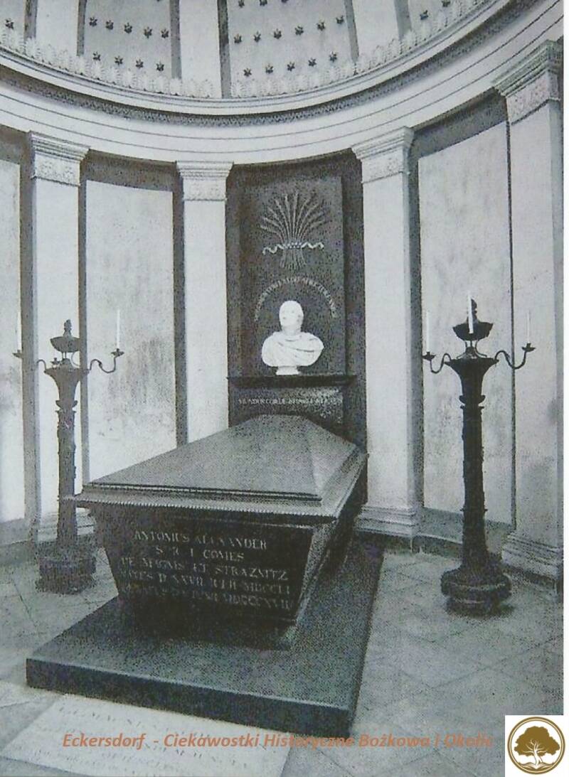 To właśnie dziesięć kłosów na żeliwnej tablicy symbolizują ich dzieci. 30 lat po śmierci męża w podziemiach kaplicy została pochowana żona hrabiego - Antonina Aleksandra Luiza Sophia von Magnis ur. Gotzen w 1848r. Na jej płycie nagrobkowej widnieje napis : „Coniugi Tandem Coniucta”- „Nareszcie na zawsze z mężem złączona”