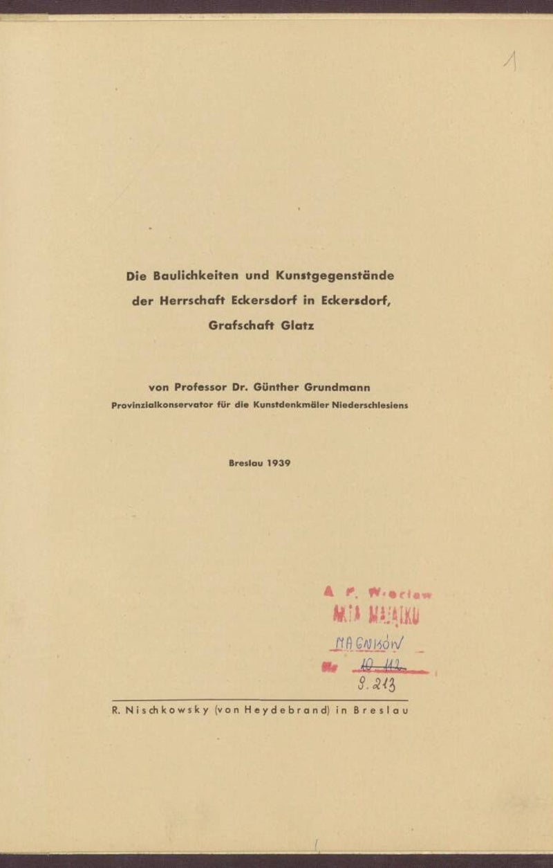 Rękopis, który napisał G. Grudmann został wysłany w 1944 roku do Niemieckiego Stowarzyszenia Studiów nad Sztuką w Berlinie. Niestety wydarzenia wojenne zniszczyły cały dokument. Wraz z nimi spłonęły oryginalne fotografie z wnętrza pałacu. Zachowały się próbne prasowe klisze z których sześćdziesiąt fotografii możemy oglądać w Instytut Herdera w Marburgu. Raport zaś, który został sporządzony w 1939 roku przez G. Grudmana, obecnie można znaleźć w Archiwum we Wrocławiu.