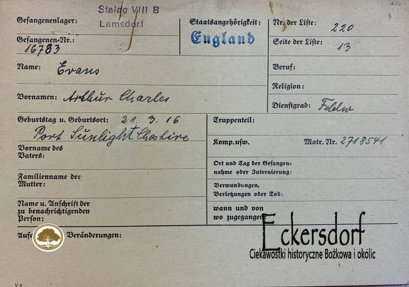 Karta informacyjna więźnia Arthura Evanii w obozie w Łambinowicach.