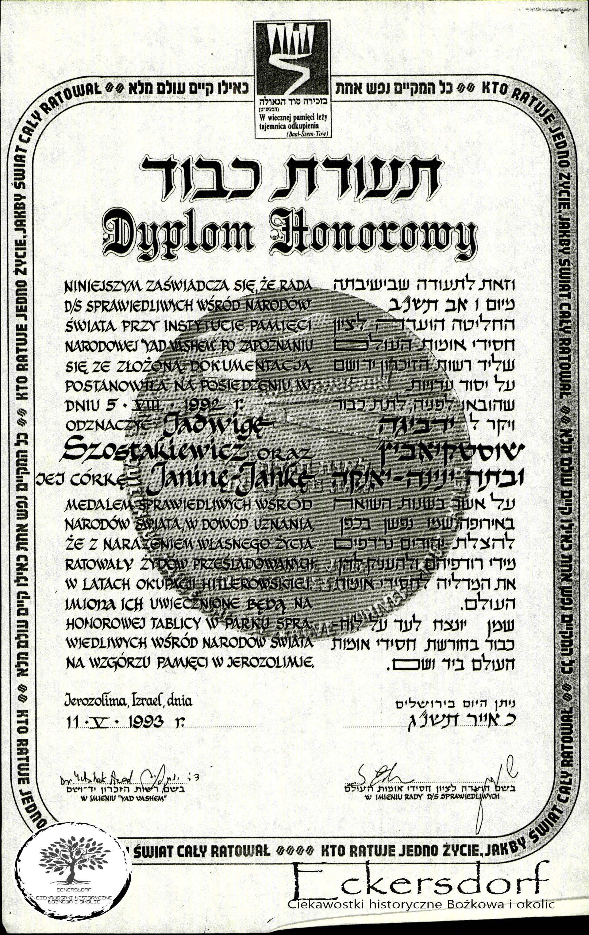 Osoby uhonorowane tytułem Sprawiedliwy wśród Narodów Świata odbierają medale i dyplomy honorowe podczas uroczystych ceremonii w Instytucie Yad Vashem w Jerozolimie lub w miejscu zamieszkania. 5 sierpnia 1992 r. Yad Vashem oficjalnie uznał Jadwigę Szostakiewicz i jej córkę Janinę za Sprawiedliwych wśród Narodów Świata (akt nr 5379). Nazwiska uhonorowanych Sprawiedliwych są również wyryte na pamiątkowej tablicy w Ogrodzie Sprawiedliwych w Jerozolimie, gdzie rosną tysiące drzew pamięci. Tabliczka z nazwiskiem Jadwigi i Janiny Szostakiewicz widnieje przy tablicy nr 35 oraz przy jesionie oznaczonym numerem 173, w rzędzie XXXII. Na medalu wręczanym Sprawiedliwym widnieją słowa pochodzące z Talmudu: „Kto ratuje jedno życie, ratuje cały świat”. Zgodnie z żydowską tradycją, termin ten odnosi się do osób pochodzenia nieżydowskiego, które swym postępowaniem chronią ludzkość przed gniewem Bożym.