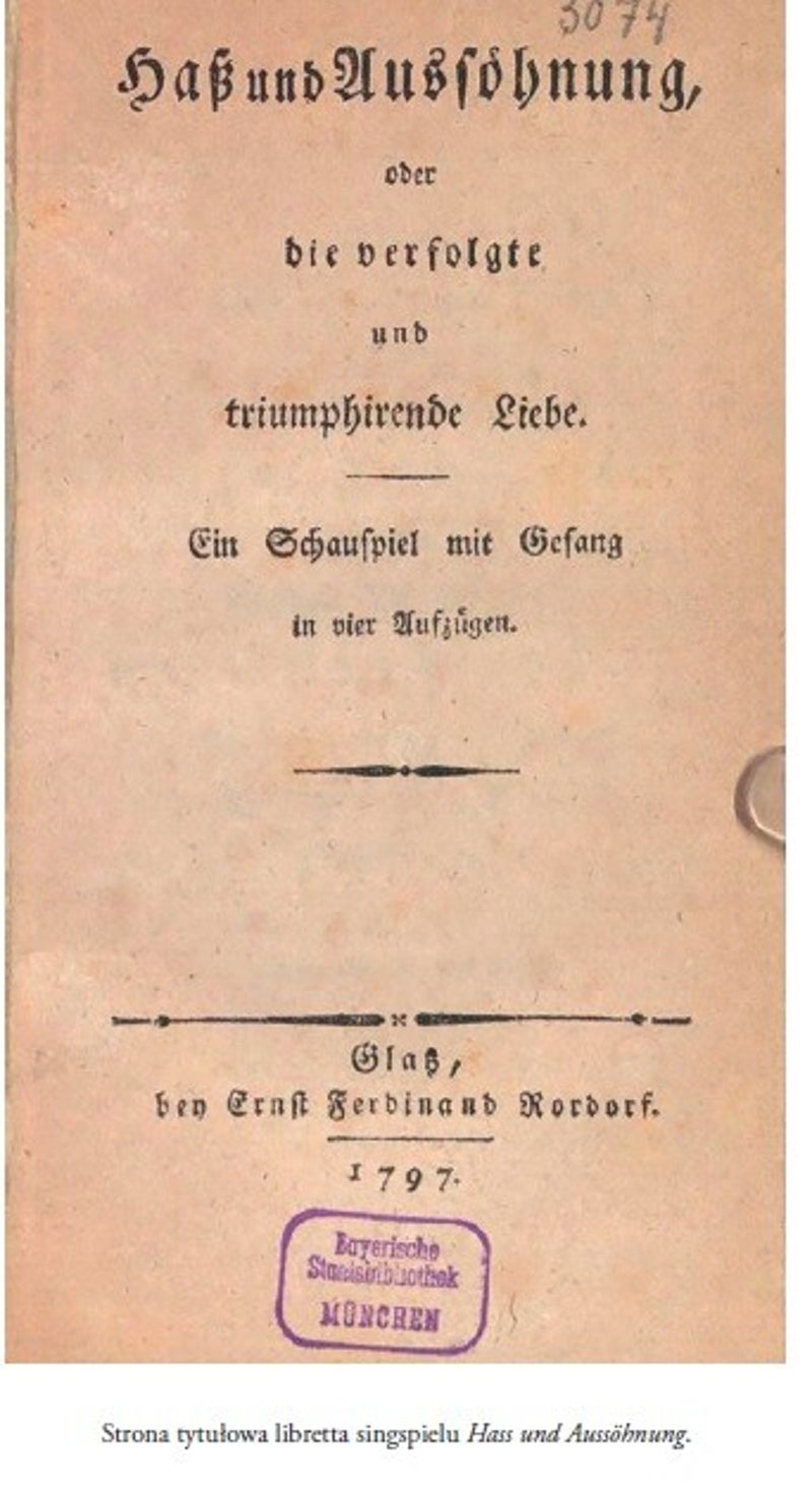 Strona tytułowa libretta singspielu Hass und Aussöhnung. J.E.F Rordorf,