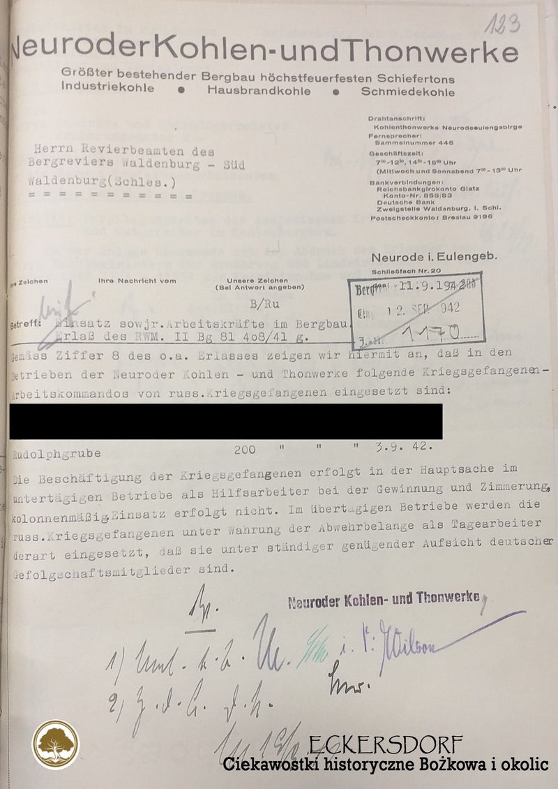 W kopalni węgla kamiennego Rudolph kolejno w latach 1942 – 1945 pracowała następująca ilość ruskich jeńców wojennych: w 1942 r. – 200 jeńców, w 1943 r. taka sama ilość 200 jeńców, w 1944 – 140 jeńców. Z kolei w hucie od 1943 roku pracowało 12 jeńców. (źródło AP Wr)