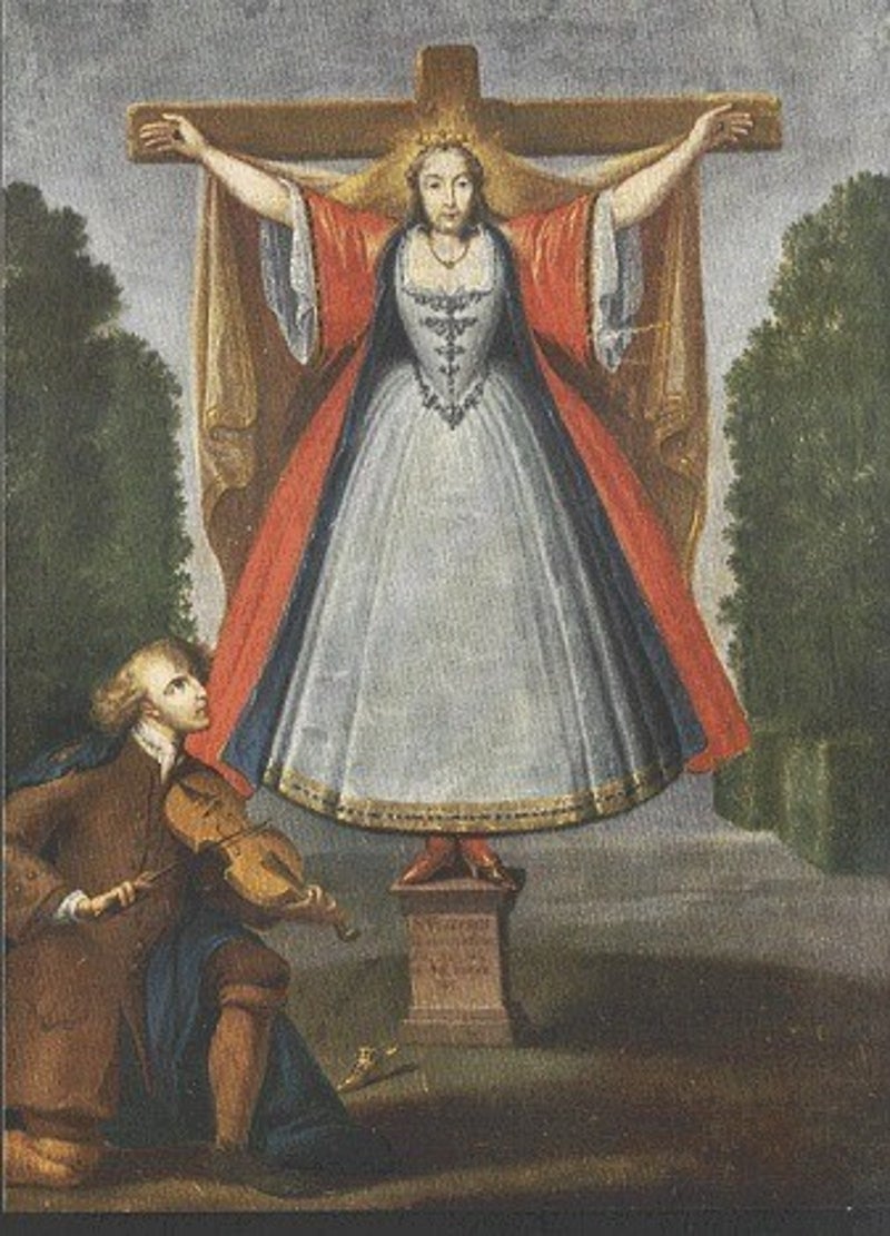 Jeszcze do rozpatrzenia jest jeszcze jedna sprawa. Dlaczego święta jak w Świecku Dolnym i Wambierzycach jest ukrzyżowana z jednym trzewikiem. Jak podaje legenda wśród pielgrzymów, którzy licznie zjeżdżali do Lukki, był pewien biedny skrzypek. Kiedy przybył pod krucyfiks nie miał żadnej ofiary. Wszystkim, co posiadał, były skrzypki i wydobywająca się z nich muzyka, którą postanowił wychwalić Volto Santo. Ten obdarował go w geście wdzięczności srebrnym trzewik, który zrzucił mu ze swej stopy. Gdy szczęśliwy skrzypek chciał spieniężyć dar , tłum oskarżył go o kradzież i został skazany na śmierć. Przed straceniem zaprowadzono go jeszcze przed cudowny krucyfiks, a wówczas przedstawiony na nim Chrystus zrzucił swój drugi srebrny trzewik, dając dowód niewinności skrzypka. Tłum zrozumiał przekaz i mężczyznę oswobodzono. Od tamtego czasu rzeźba posiada tylko jeden bucik.