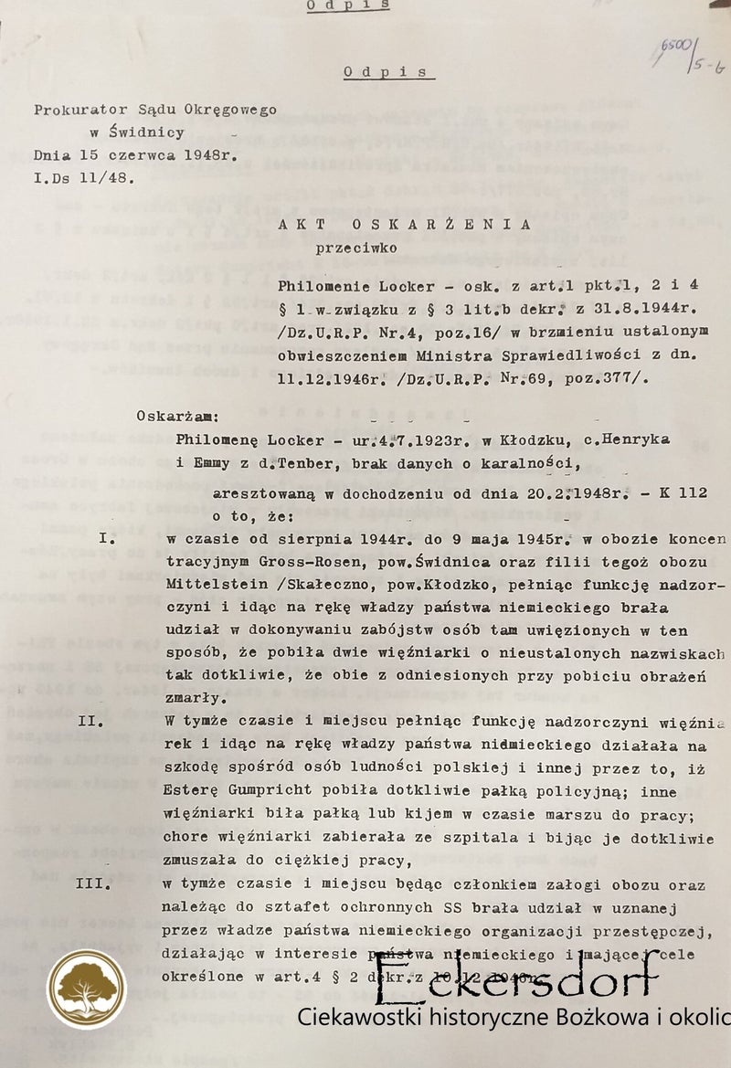 W akcie oskarżenia, który wpłynął do Sądy Okręgowego w Świdnicy 15 czerwca 1948 roku, nie tylko oskarżono o zabicie więźniarek ale dodatkowo obciążono Philomene Locker o przynależność do organizacji SS, czyli do organizacji przestępczej. Została skazana przez Sąd Okręgowy w Świdnicy w dniu 20 października 1948 roku sygn. akt. V K.9/48 / na 7 lat więzienia z utratą praw publicznych i obywatelskich na 7 lat i konfiskatę mienia.