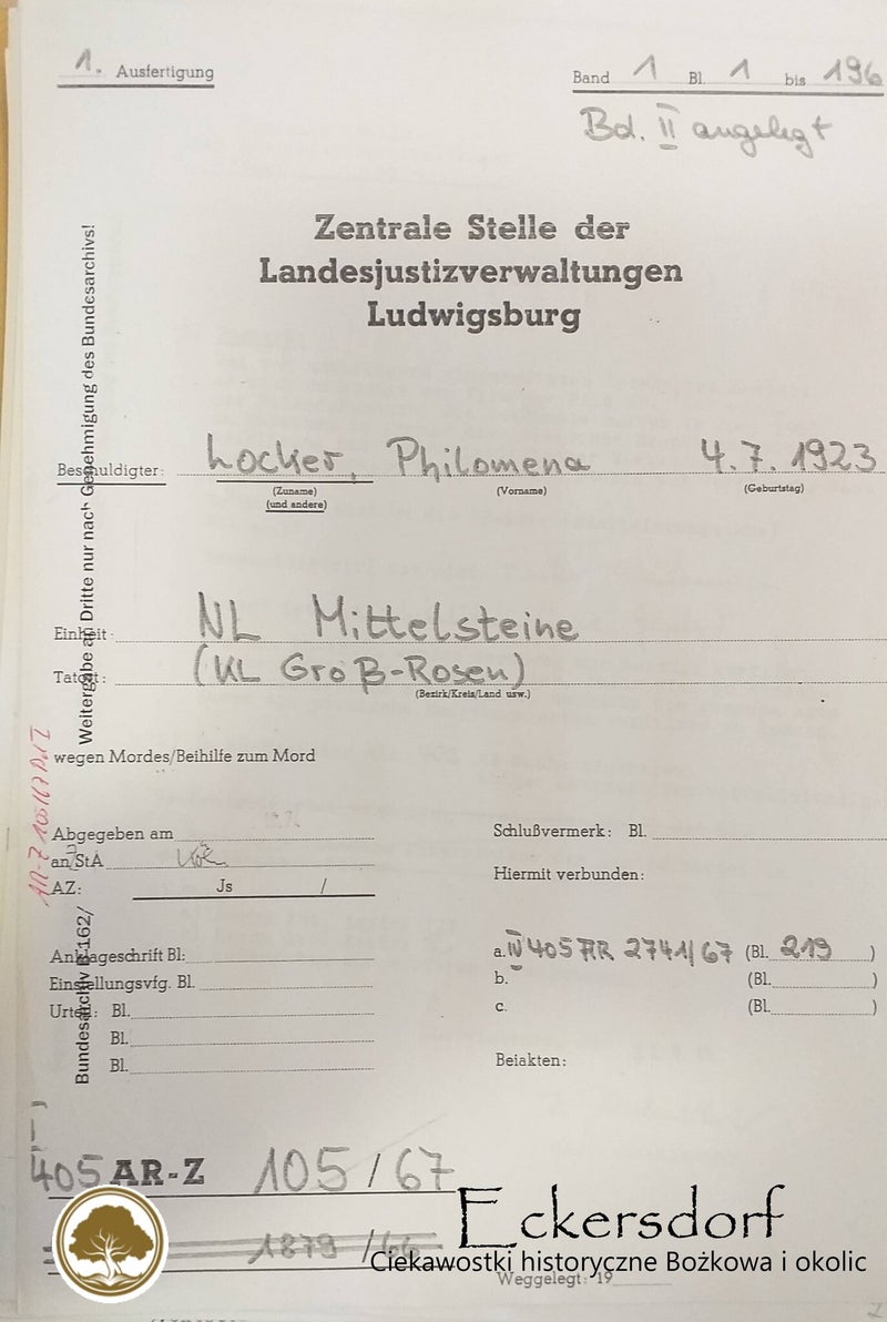 Czytając akta sprawy dowiedziałem się, że dnia 7 października 1946 r. studentka Anna Dostorczyk złożyła doniesienie, że na terenie Monachium rozpoznała dozorczynię obozu - esesmankę Philemenę Locker. Świadek zeznała, że została z obozu koncentracyjnego Oświęcim odtransportowana do podobozu Mittelsteine. Pracowała w fabryce amunicji oddalonej od obozu ok. 3 km. (kobiety z obozu oprócz prac wykonywanych w zakładzie Aberta Patina Werkstätten für Fernsteuerungstechnik GmbH dodatkowo pracowały w firmie dla producenta uzbrojenia i amunicji Totex, Spółki Metallwarenfabrik Spreewerk GmbH, należącej do Deutsche Industrie-Werke AG (DIWAG), oraz dla innych koncernów DIWAG produkujących amunicję, zakład ten trudno jest zlokalizować, umieszczony był w terenie zalesionym w Ścinawce Sredniej). Więźniarka Anna zeznała, że dozorczyni Philemena Locker znęcała się tam nad więźniarkami.Śledczy rozpoczął dochodzenie i zaczął szukać miejsca zamieszkania świadków, czyli byłych więźniów obozu z Mittelsteine. 13 listopada 1946 w Monachium odbyło się rozpoznanie oskarżonej przez świadków i złożenie zeznań. Pierwsza złożyła zeznania Dora Gumpricht.Dora Gumpricht - „ Przybyłam do obozu Auschwitz w sierpniu 1944 r. i z stamtąd 3 dni później zostałam wywieziona do obozu FAL Mittelsteine, zlokalizowanego blisko Kłodzka. Przebywałam tam przez 9 miesięcy. Miesiąc przed końcem wojny zostałam przeniesiona wraz z 200 polskimi i węgierskimi kobietami do podobozu Grafenort (Gorzanów). W Ścinawce Średniej byłam delegowana wraz z innymi więźniami do fabryki amunicji, która mieściła się poza obozem (około 2 mile). Tam pracowaliśmy na 3 zmiany. Za każdym razem byliśmy prowadzeni do i z miejsca pracy przez dozorczynie. Wśród tych dozorczyń była również wskazana przeze mnie Philemena Locker, choć dane personalne nie było mi jej znane. Była dozorczynią bardzo surową. Zawsze nas obwiniała i biła swoją pałką, kiedy szliśmy do pracy. Byłam świadkiem jak pobiła dwie kobiety, jedną Węgierkę, a drugą Polkę. Później zmarły one po kilku dniach na izolatce. Ja osobiście przez Locker nie byłam bita, ale moja mama już tak. Po wyzwoleniu przenieśliśmy się do Bawarii, tam opowiadałam lokalnym władzom o Locker i o innych strażniczkach. Mogłam wtedy podać wiele szczegółów, że można by było napisać książkę. Dziś nie pamiętam już dokładnych szczegółów”.
